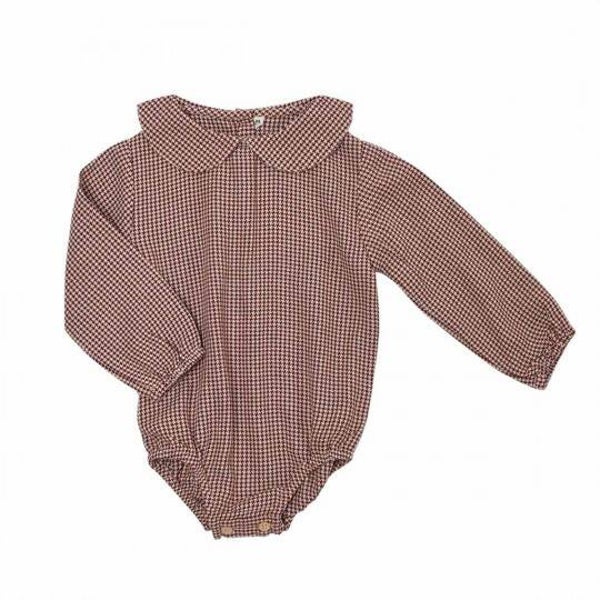 Een romper met lange mouwen en een unisex, klassieke en tijdloze look met zijn mooie pied-de-poule-patroon in donkerrode tinten. Schattige detals zoals de lange mouwen die iets strakker zijn aan de manchetten, het kleine Milano-kraagje en de mooie houten knoopdetails aan de voorkant. Het sluit over de gehele lengte van de rug en bij het kruis met drukknopen.