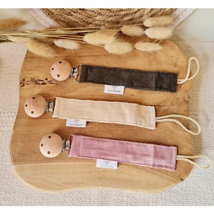 Nooit meer een speentje kwijt! Dit handgemaakte katoenen speenkoord van fijne ribstof is heel handig te bevestigen aan kleding of doekje/speeltje met de houten clip