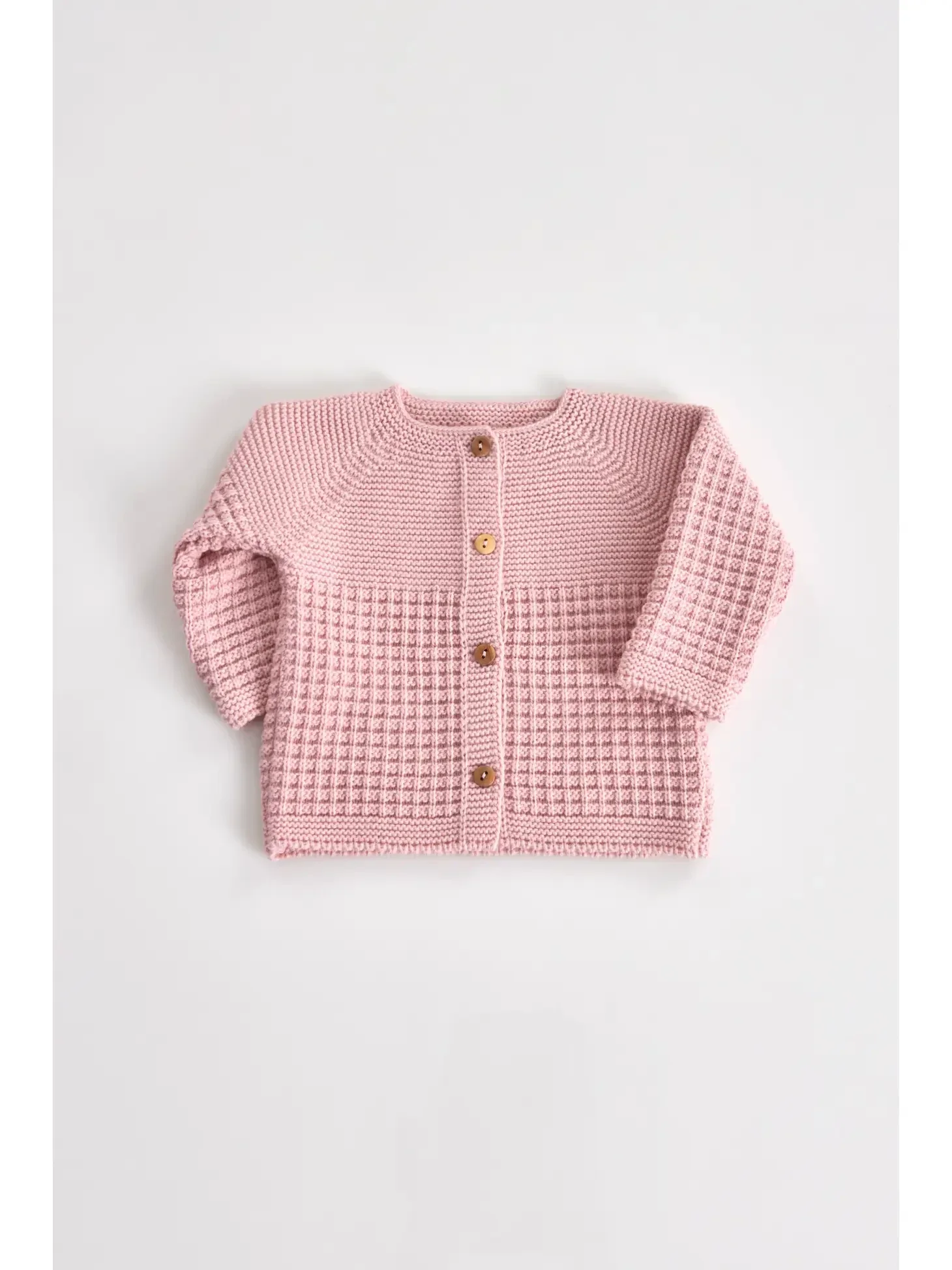 Superschattig vestje in prachtig wafelpatroon met bijbehorende muts. Mooie details zoals de kleine houten knoopjes.