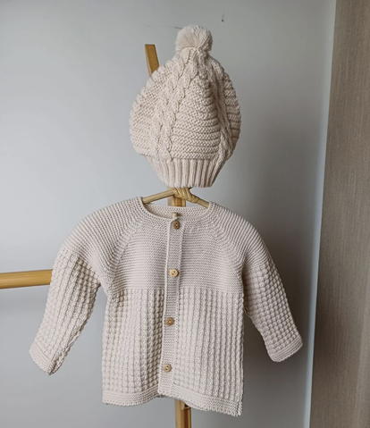 Superschattig vestje in prachtig wafelpatroon met bijbehorende muts. Mooie details zoals de kleine houten knoopjes.